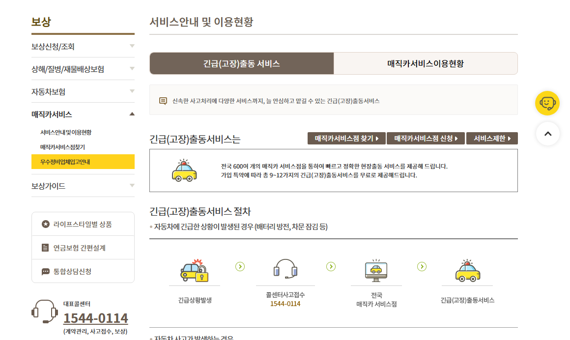 KB다이렉트는 전국 600여 개의 매직카 서비스 제휴점을 통해 24시간 365일 긴급출동 서비스를 제공하고 있습니다. 콜센터 번호 1544-0114로 언제든 연락하면 야간이나 주말, 공휴일에도 신속한 현장 지원을 받을 수 있습니다. 가입한 특약에 따라 다양한 긴급출동 서비스가 무료로 제공됩니다.